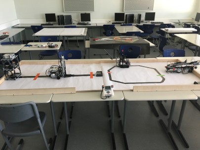 Der Arbeitsbereich entwickelt für das Hessische Kultusministerium, die Hessische Lehrkräfteakademie und die Hessische Landesstelle für Technologiefortbildung aktuell eine mehrtägige Fortbildungsreihe zum Thema Digitalisierung technischer Berufe / Industrie 4.0 für Lehrpersonen an Berufsschulen Link Projekt. Anstelle hier mit aufwändigen und betriebsnahen Anlagen und Hardwarekomponenten zu arbeiten, wird hier ein anderer Weg der Technologie-Handhabung eingeschlagen: Mit Lego-Mindstorm-Elementen wird eine industrielle Logistik-Umgebung in großer Komplexität simuliert, so dass Sensorik, Aktorik, Vernetzung, Daten-Präsenz und -Verarbeitung dem entsprechen, was aktuell in smarten Produktionsumgebungen umgesetzt wird. Dem Nachteil, dass hier mit „Spielzeug“ gearbeitet wird, stehen zwei enorme Vorteile gegenüber: 1. Die gesamte Technik ist – bei gleicher Funktionalität – einfacher, zugänglicher und transparenter. 2. Alles lässt sich mit geringen Kosten und Aufwand erweitern, ergänzen und auf dem neuesten technischen Stand halten. Im Herbst startet die Fortbildungsreihe als Pilotstudie mit 5 heterogenen Dreierteams (Lehrpersonen aus den Bereichen Mechatronik, Metalltechnik, Elektrotechnik und Informatik) aus verschiedenen hessischen Berufsschulen. Das Konzept der Fortbildung integriert a) eine fundierte Einführung in die Technologie durch einen Industriepartner (SAMSON-AG), b) einen didaktisch-methodischen Input durch die TU Darmstadt und c) die eigenständige Entwicklung innovativer Unterrichtssequenzen der Lehrpersonenteams. Diese Entwicklung individueller I 4.0-Lernumgebungen durch die FortbildungsteilnehmerInnen wird unmittelbar von jenen Lehrpersonen (aus den Berufsschulen Hanau und Offenbach) betreut, die das good-practice-Beispiel für die Fortbildung (Foto_1) (Foto_2) entwickelt haben. Die Abbildung zeigt den Lernträger, in welchem eine Roboter-Transport-Umgebung mit Förderband und Hochregal realisiert wurde. Die beiden anderen Fotos zeigen die Lego-Roboter.